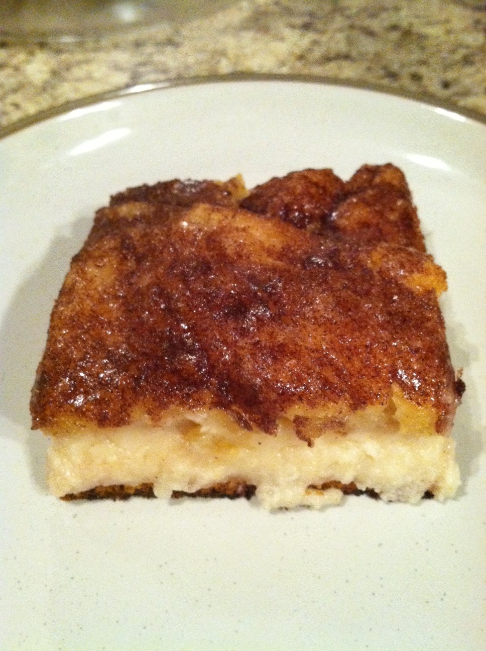 Melt one stick (or 1/2 cup) butter in a separate dish and pour evenly(ish) over the top of the crescent topping. I use a spoon to spread it onto all areas that sometimes don’t get butter due to my mixture being unlevel. In yet another dish, mix together the remaining 1/2 cup sugar and 1 tbsp of cinnamon and sprinkle the entire amount over the top of the dish. I use my hand.. one handful after another until I’ve got it as even as I can..
