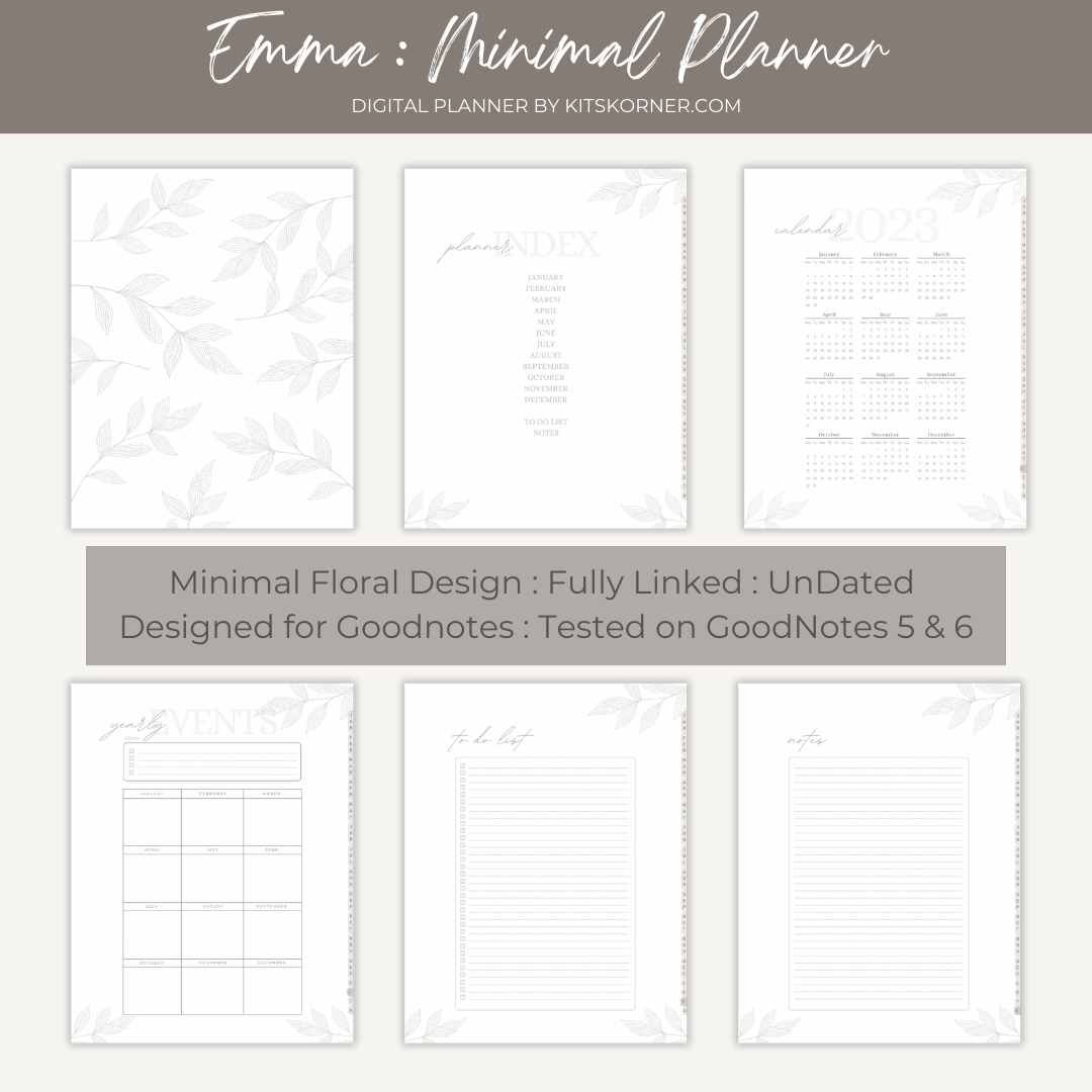 Introducing Emma, the fully linked minimal digital planner that is perfect for those who appreciate simplicity and functionality. With its light brown line art design, Emma provides a clean and calming aesthetic that will help you stay organized without distractions.